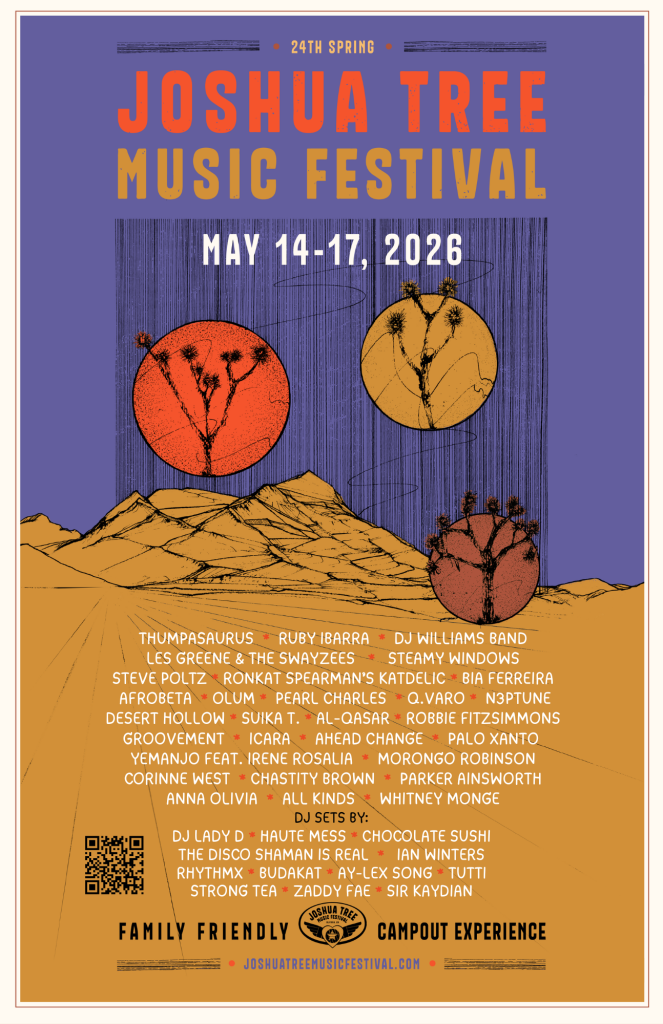 Joshua Tree Music Festival founder and organizer, Barnett English, has traveled to, attended and worked at over 650 camp-out music festivals since 1993 with his organic espresso café, JavaGogo. On a whim, JavaGogo came to the Joshua Tree Lake Campground in October 2002 to serve up fresh bevvies at the JT Didgeridoo Festival. Barnett recounts, “I drove in at night, then awoke to the magical sweeping views of the National Park and the Copper Mountains. Upon meeting our gracious hosts (the JT Lake Campground owners), I told them it’d be a great site for a music festival! They said, “If it’s such a great idea, then you should go for it.”
